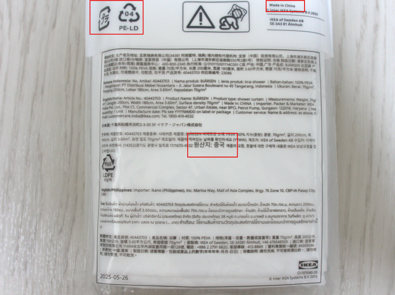 중국산이다. 포장 재질은 재활용 가능 , PEVA 소재로 된 것을 구매해야 인체에 무해하다고한다.