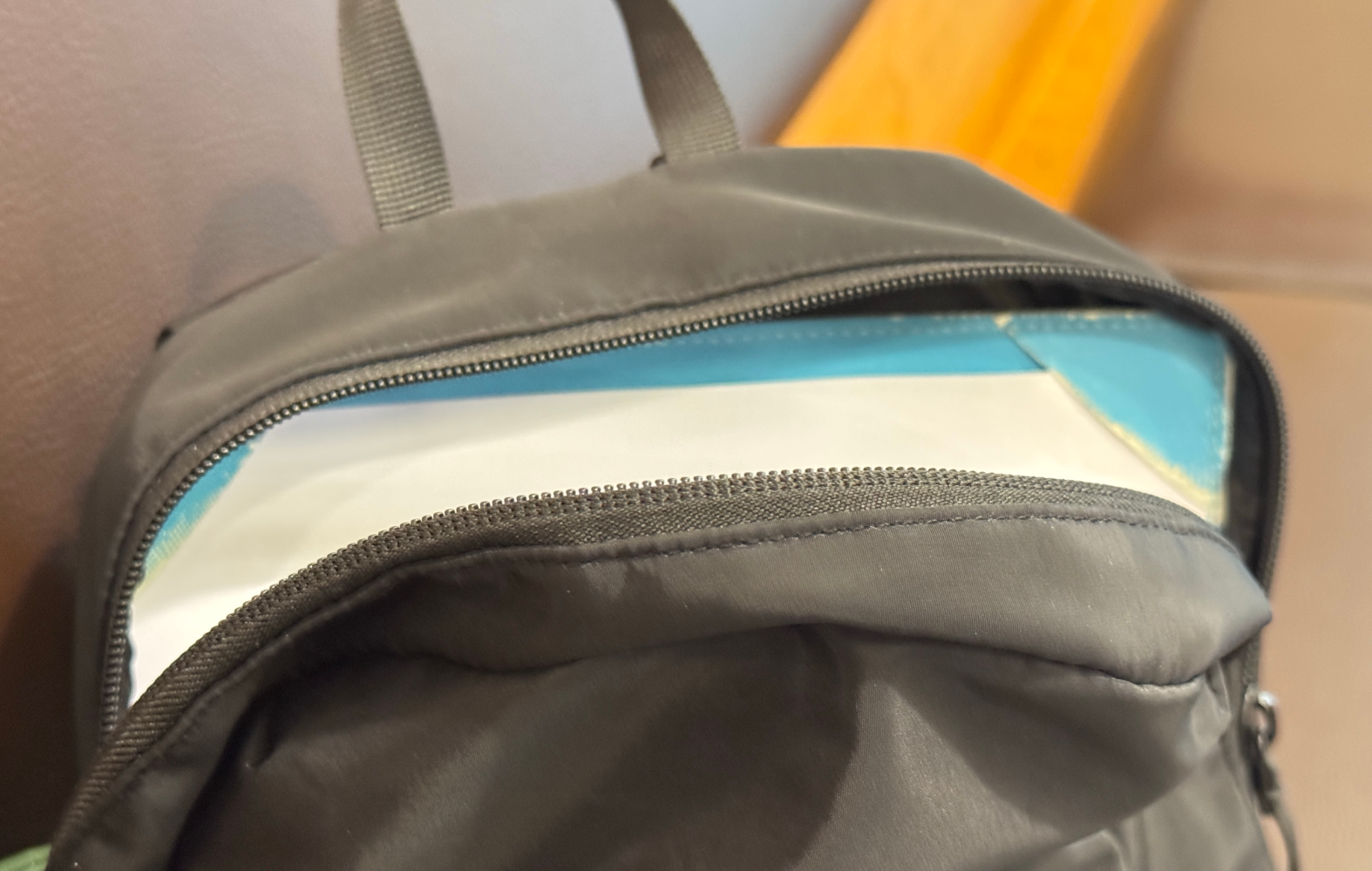 담앤드솜 이지나일론 백팬은 A4지가 들어가지 않는다. 사진처럼 상단 부분이 눌리게 된다. 별도 보관함에 넣고 살짝 구부리면 들어가긴 한다.