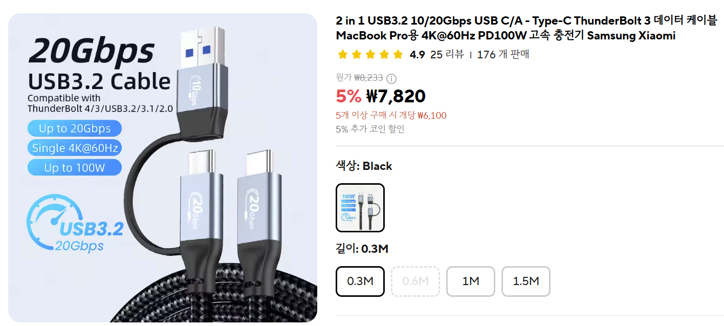 만약, 새로 구매한다면 USB-C , USB-A 동시에 지원하는 제품으로 구매할 것 같다. 60cm가 딱인데.... 품절이다.