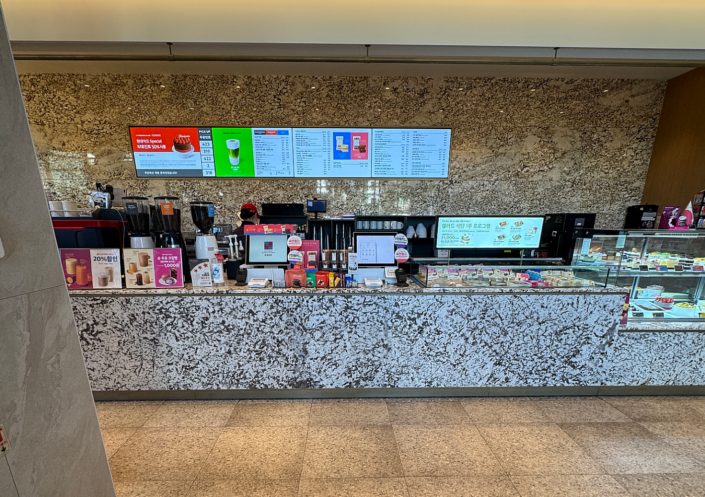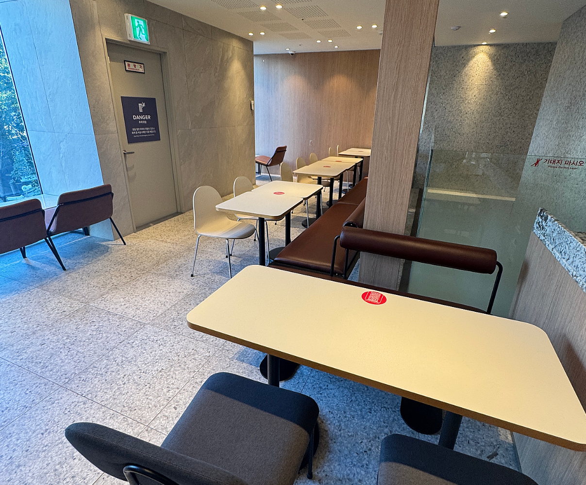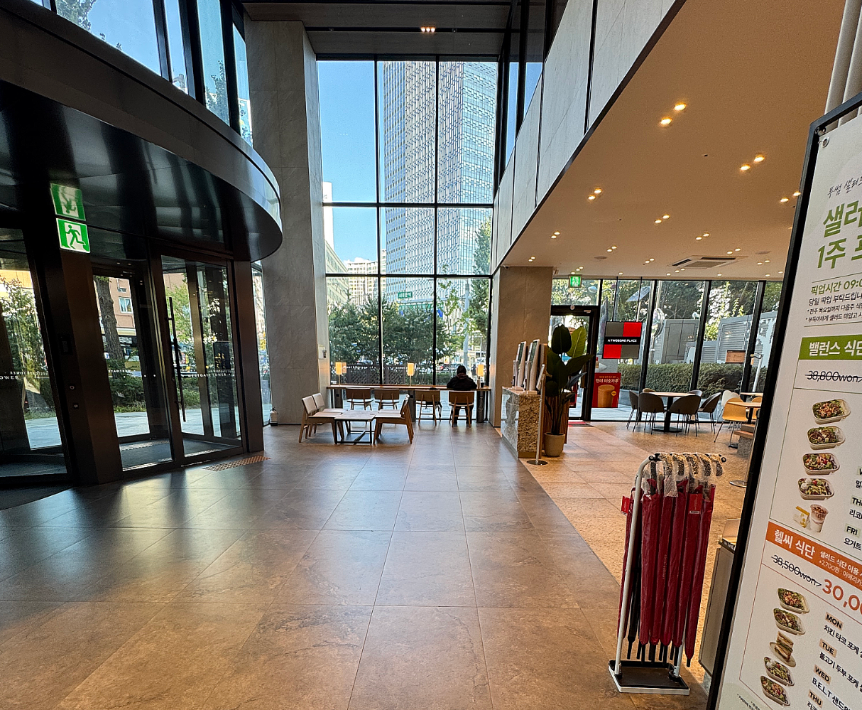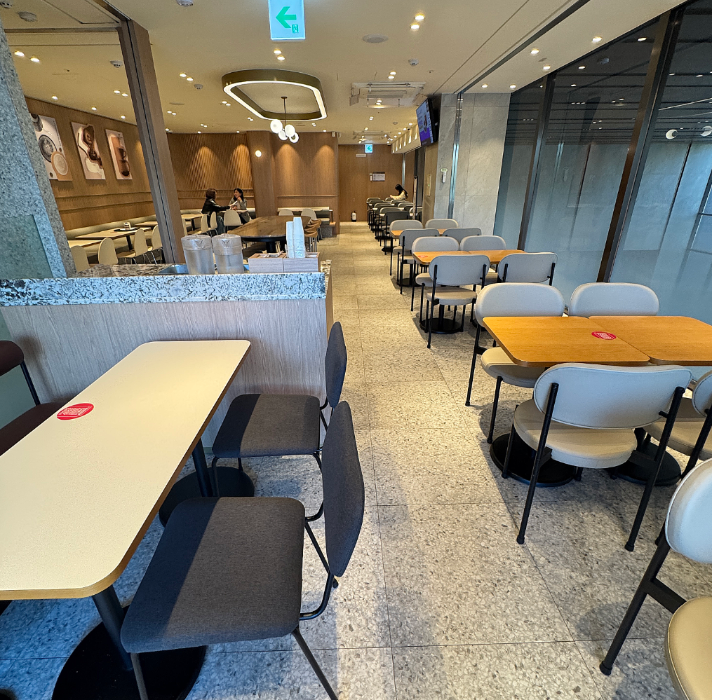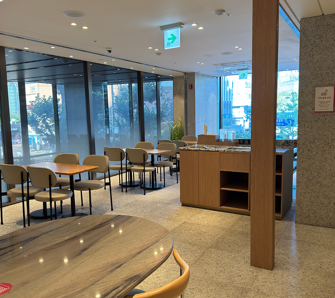 1층에도 좌석이 있다. 건물 로비에 있는 매장이기 때문에 공간이 시원시원하다.