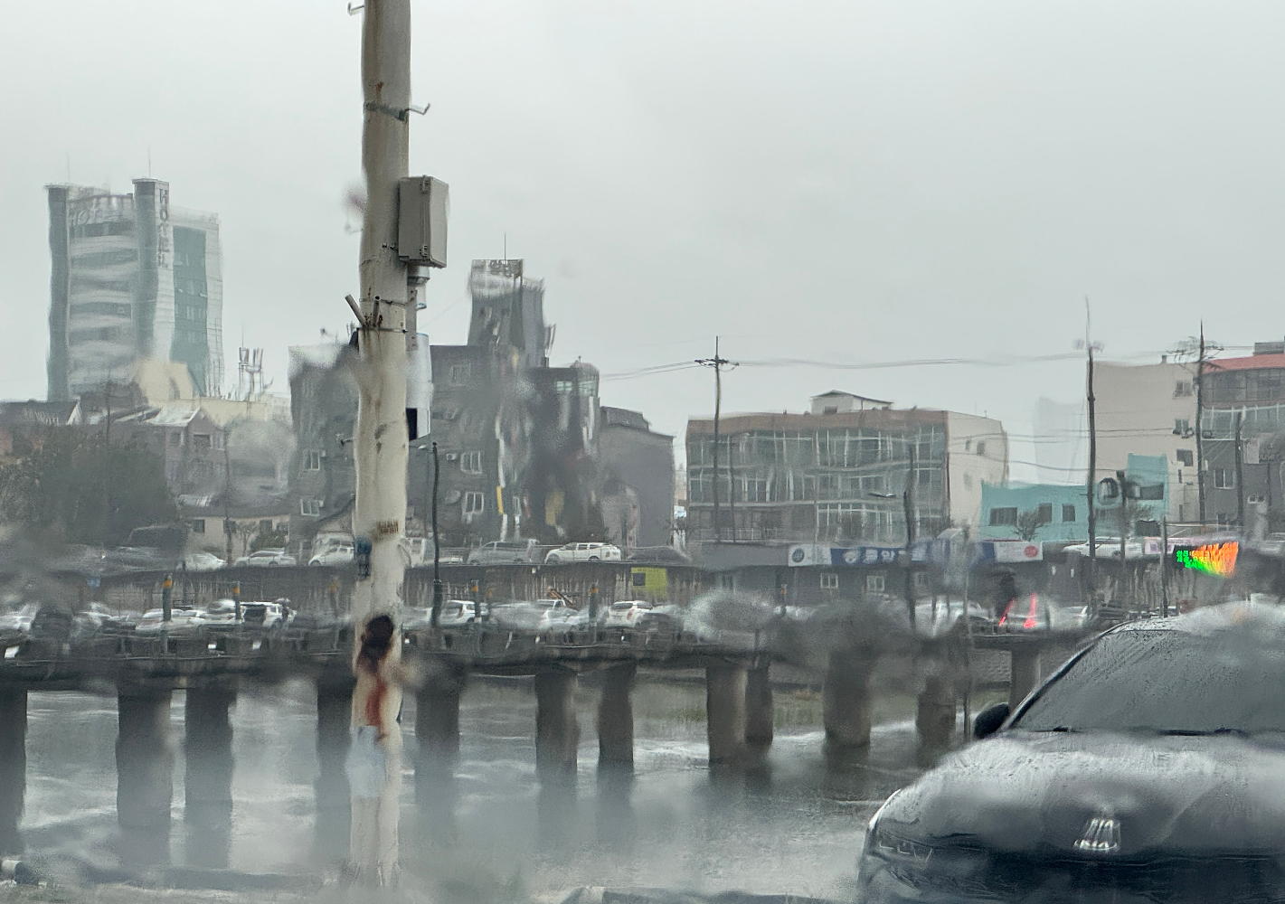 중앙시장 건너편 주차장의 모습인데, 유리창의 빗물 때문에 전봇대에 마치 어떤 여인이 서 있는 것처럼 보인다.