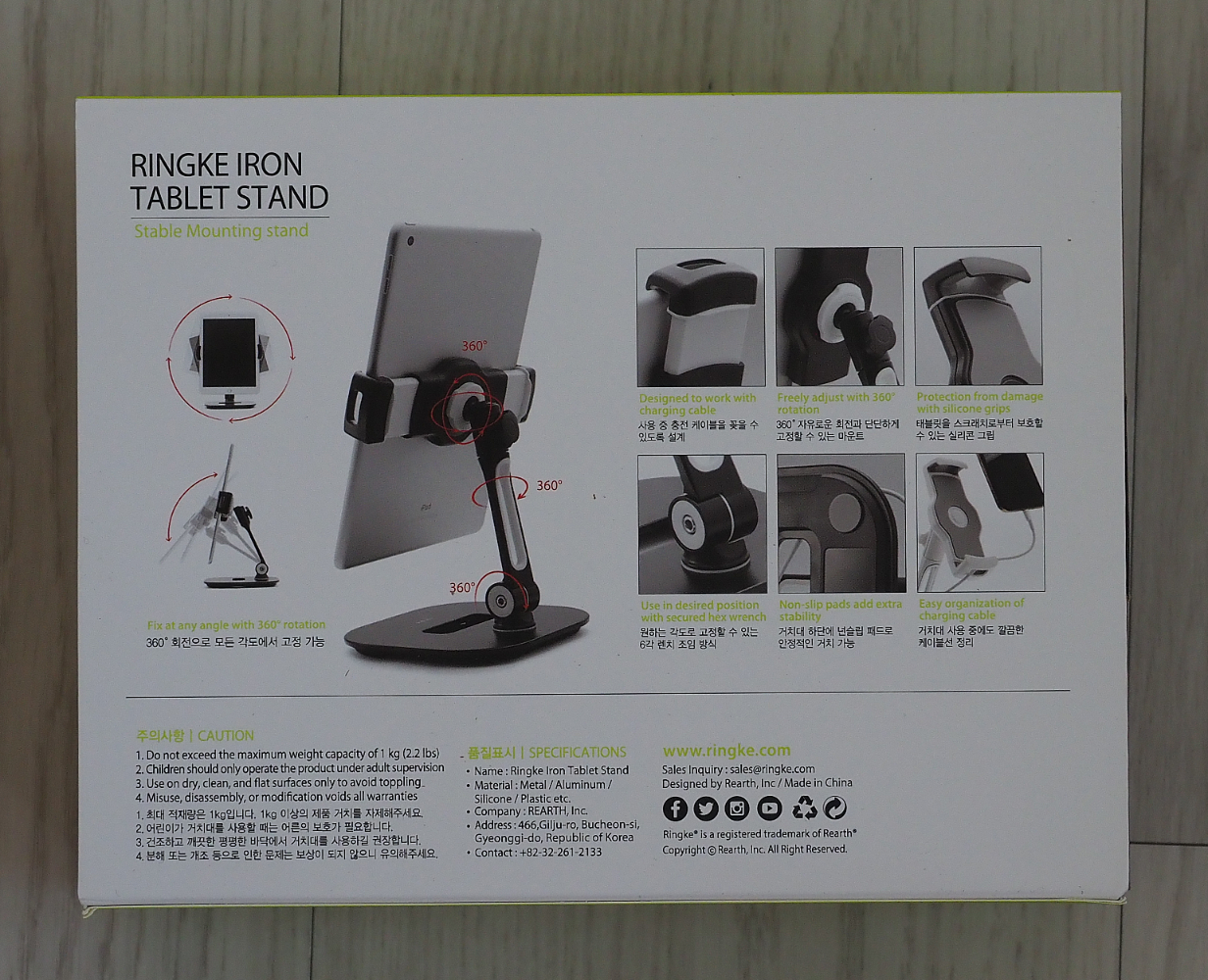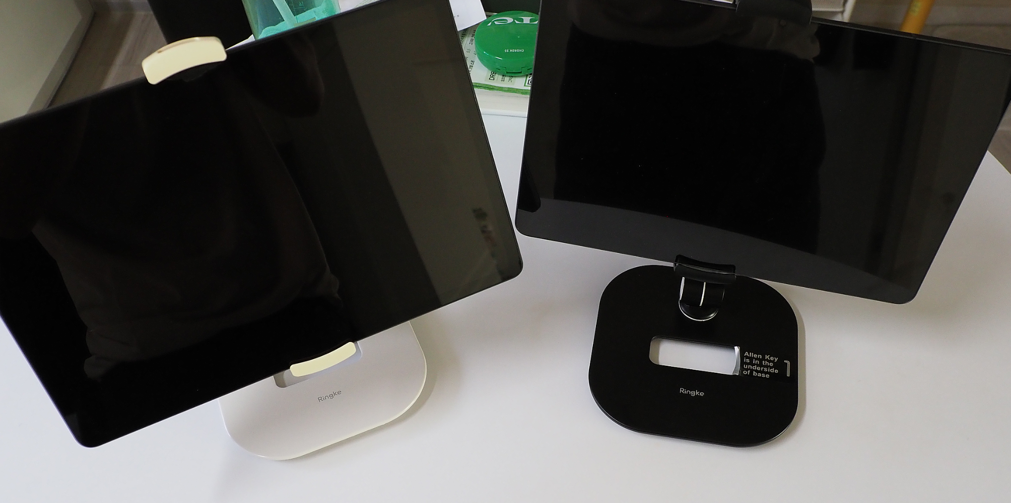 거치대는 링케 제품이 좋은데, 하단 지지대가 무거워서 움직이지 않는다. 테블릿을 거치할 때 상단 부분을 지지하는 부분이 움지이지 않는 부분을 위로 하게 하면 된다.