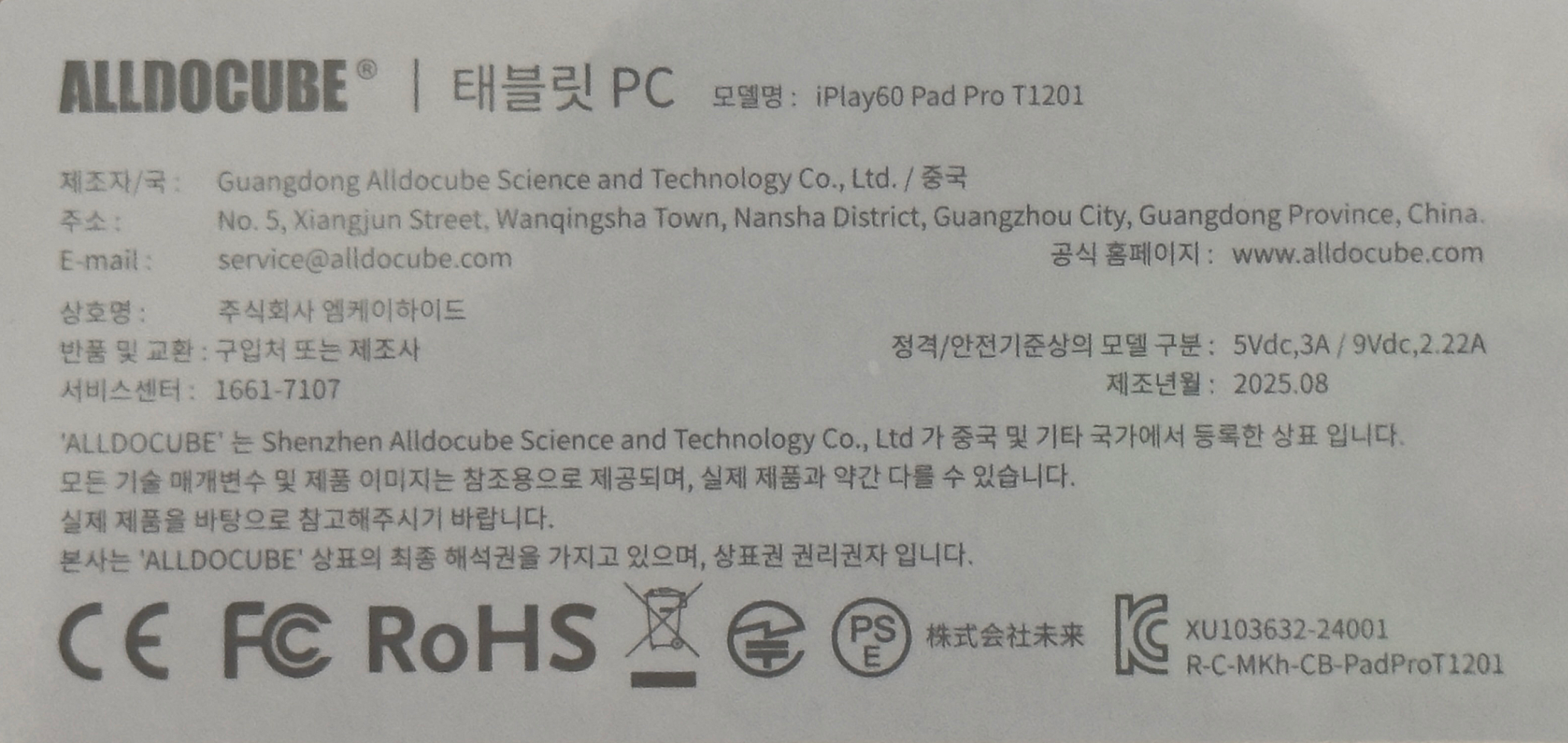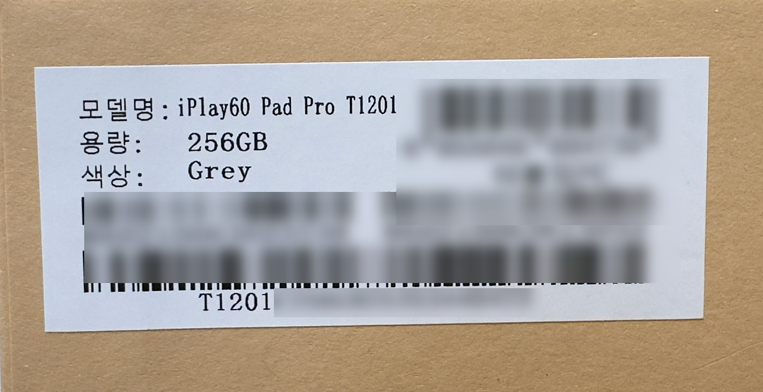 iPlya60 Pad Pro T1201이 기기 모델명이다. 일부러 메모리와 용량이 더 큰 제품으로 구매했다.